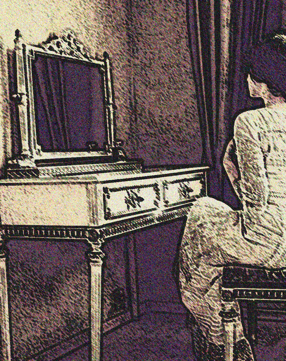 I opened the front door, and stepped into a dark house; the lights had all been turned out, save for the small lamp in the kitchen that burns through the night. The dinner table had been cleared, there was no food set out for me, and I was possessed by a hunger I have not known in years. An anger rose from deep in my gut, that I should be treated with such disregard, not only by my wife, but by our cook who is merely the hired help. I knew exactly where my erstwhile bride could be found and I intended to give her a piece of my mind.