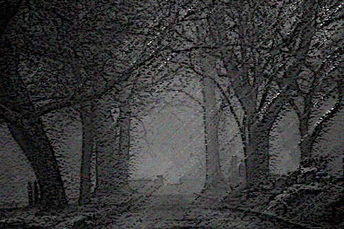 The moon broke through the clouds once more and the kids all came to a sudden stop. Through the billowing fog, I saw large, squat silhouettes, off in the distant trees.
